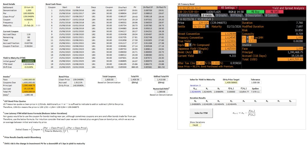 This Excel spreadsheet demonstrates how to price a US Treasury Bond and exactly match live tradable Bond price shown in Bloomberg. Using a live market example we also compute the accrued interest, clean- and dirty price of a US treasury bond. We also show how to solve for its yield to maturity and compute the present value of the bond cash flows.